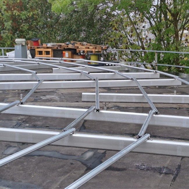 Voor deze installatie hebben we een speciaal op maat gemaakt frame ontwikkeld. Dit frame is zorgvuldig ontworpen om perfect aan te sluiten op het ronde dak. Dit laat onze flexibiliteit en expertise in het omgaan met specifieke architecturale omstandigheden zien.